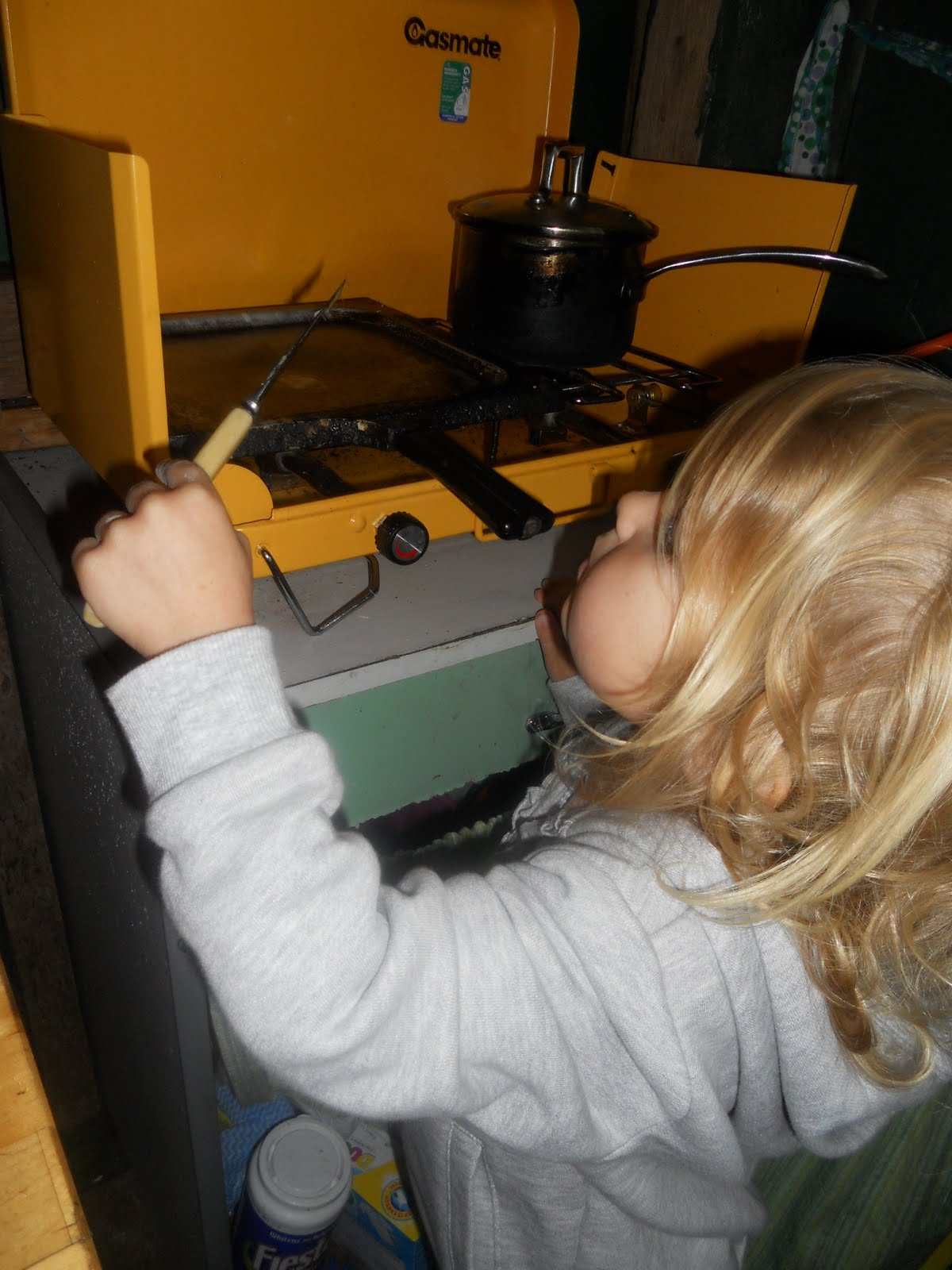 I cooked the pancakes. In her little cup she'd made just enough mixture for four small pancakes, two each, she announced. She's only just turned three and can count and divide quite naturally without being taught.